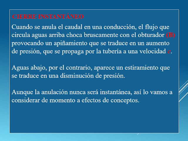 El fenómeno del golpe de ariete, también denominado transitorio, consiste en la alternancia de depresiones y sobrepresiones debido al movimiento oscilatorio del agua en el interior de la tubería, es decir, básicamente es una variación de presión, y se puede producir tanto en impulsiones como en abastecimientos por gravedad.